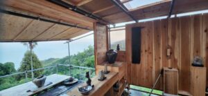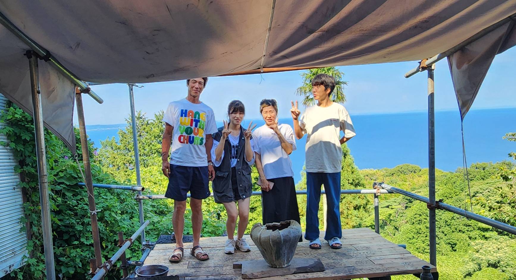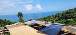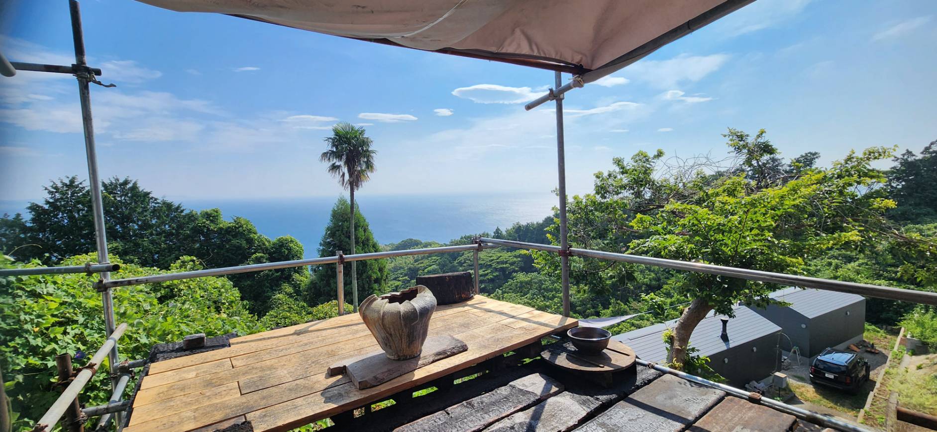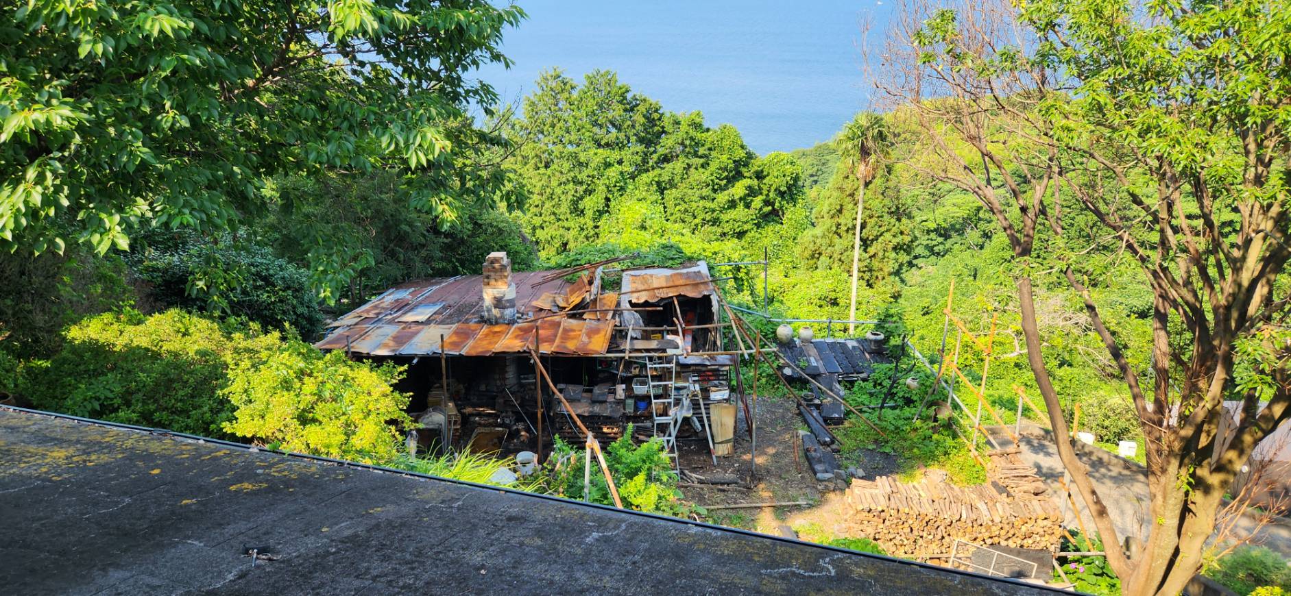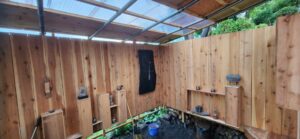 暑熱の7月、8月、昨年漏電火災で焼失したデッキ小屋の再建と窯屋根の補修を行なった。