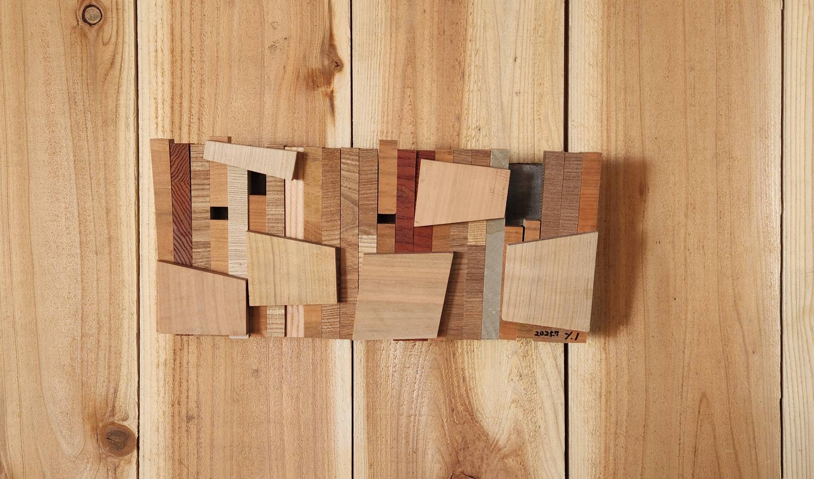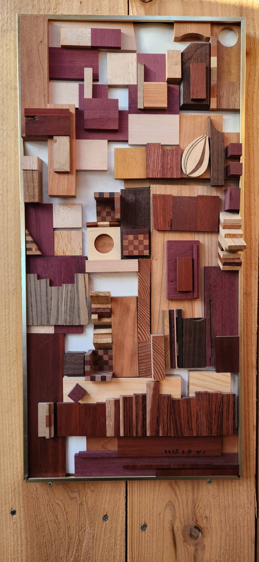 昨年4月より同居することとなった妹ー洋子がライフワークとしてきた箱根細工の端材(木片)による平面構成。